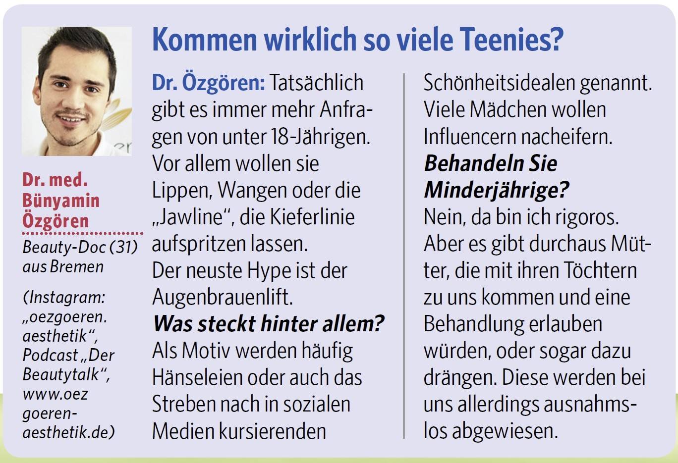 Ein Interview der Bild der Frau (Ausgabe August 2020) zum Thema Schönheitsbehandlungen bei Teenies.