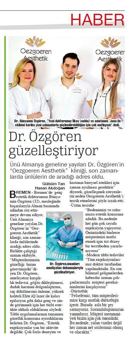 „Dr. Bünyamin Özgören ist der Shooting Star der Minimalinvasiv-Szene: Seine Praxis befindet sich in Bremen, aber seine Kundschaft ist auf ganz Deutschland verteilt – sehr viele treten dabei aus Hamburg die Reise in die benachbarte Hansestadt an. ganz-hamburg.de unterhielt sich mit dem sympathischen „Beauty Doc“ – wie er selber genannt werden will – über die derzeitige Lage in Sachen „gutes Aussehen und was man dafür machen kann“.“