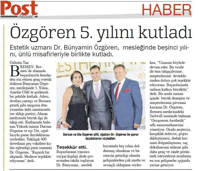 Artikel der türkischsprachigen Post Aktuel über das 5 jährige Bestehen unserer ästhetischen Arztpraxis.
