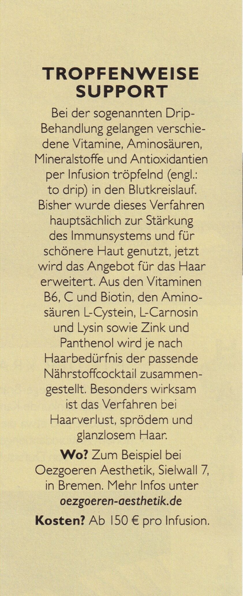 Artikel der Zeitschrift Grazia zur Drip-Spa Behandlung bei Oezgoeren Aesthetik.